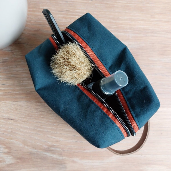 Een stoere en sobere pouch gemaakt uit drywax katoen in een mooi donkerpetrol. Binnenin een terracottakleurige katoen. Dezelfde tint rits met zwarte tandjes en trekker. Afgewerkt met een lederen accent.