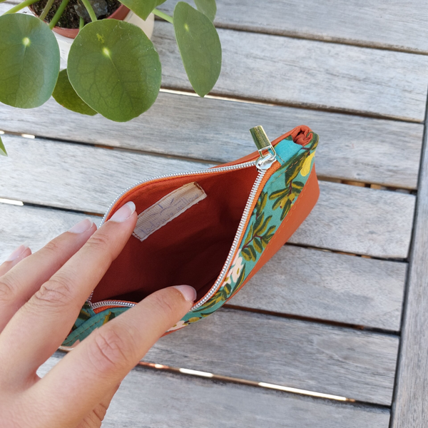 Terracotta kunstleer, citrusfruit print, terracotta katoen, goldfish rits met zilveren tandjes en trekker.