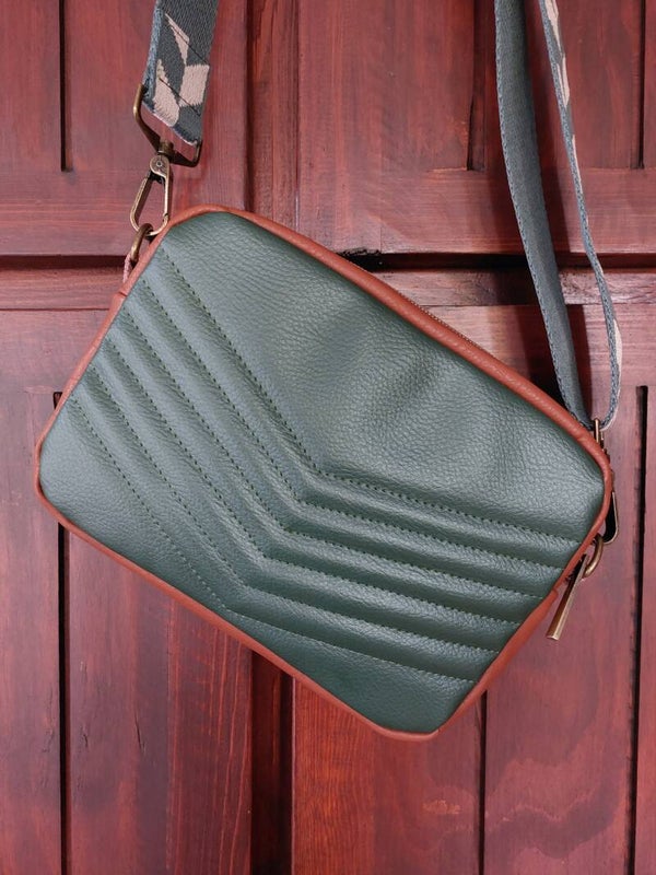 Het doorstikte voorpaneel vooraan ziet er heel elegant uit en geeft een leuk accent. De tas sluit met een rits met een fijne trekker. Binnenin zijn er geen onderverdelingen voorzien. De Adora is gemaakt uit een prachtige kwaliteit metallic donkergroen en vintage-look cognac kunstleer. Binnenin is een warm oranje stof met visgraat structuur gebruikt. Afgewerkt met een oranje biais.