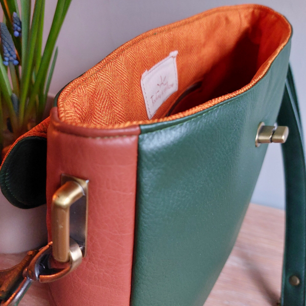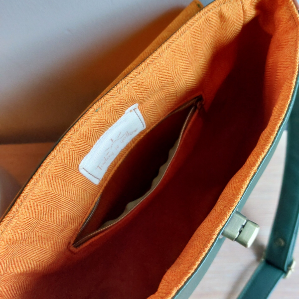 De Chloe is een fijne tas die je als crossbody of schoudertas kan dragen dankzij de verstelbare riem. De flap sluit met een draaislotje. De buitenkant van de tas is gemaakt uit kunstleer in de kleuren groen, met een zachte metallic schijn en vintage cognac. Binnenin een oranje stof met visgraatmotief. De tas heeft 1 groot vak waarin nog een klein ritsvakje voorzien is voor kleinere spullen of gsm.